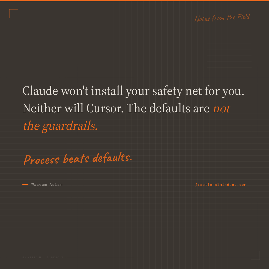 Claude is not going to install your safety net for you. Cursor isn’t either. Railway won’t scope your keys properly just because you assumed it would. The defaults are not the guardrails. The process is the guardrail, and the process has to be yours.